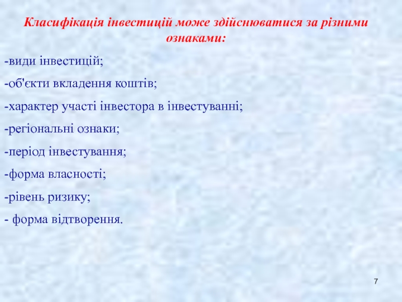 Слайд 7Класифікація інвестицій може здійснюватися за різними ознаками: