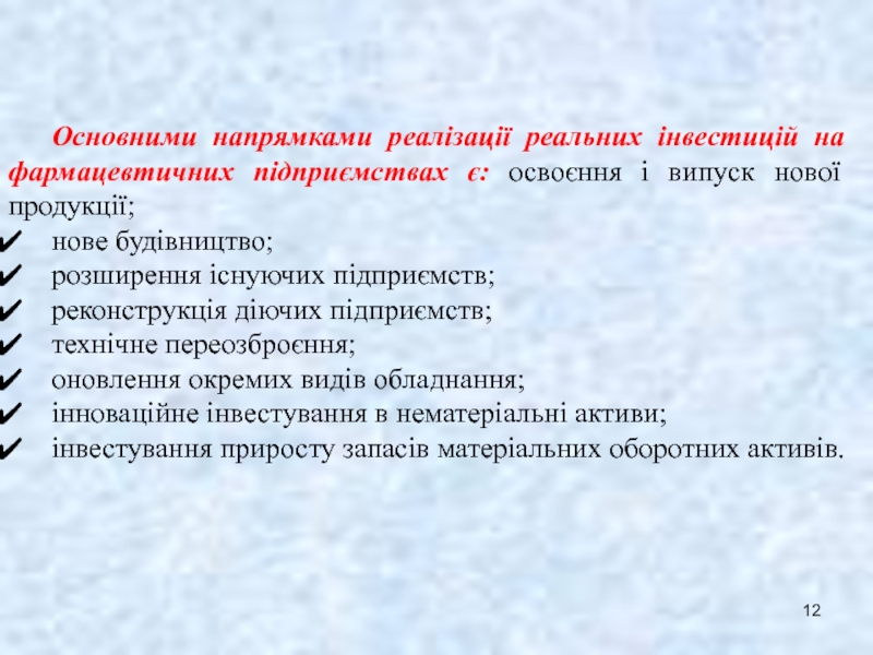 Слайд 12Основними напрямками реалізації реальних інвестицій на фармацевтичних підприємствах є: освоєння
