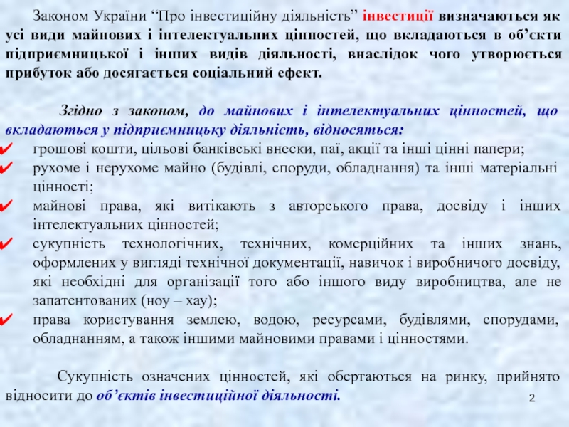 Слайд 2Законом України “Про інвестиційну діяльність” інвестиції визначаються як усі види