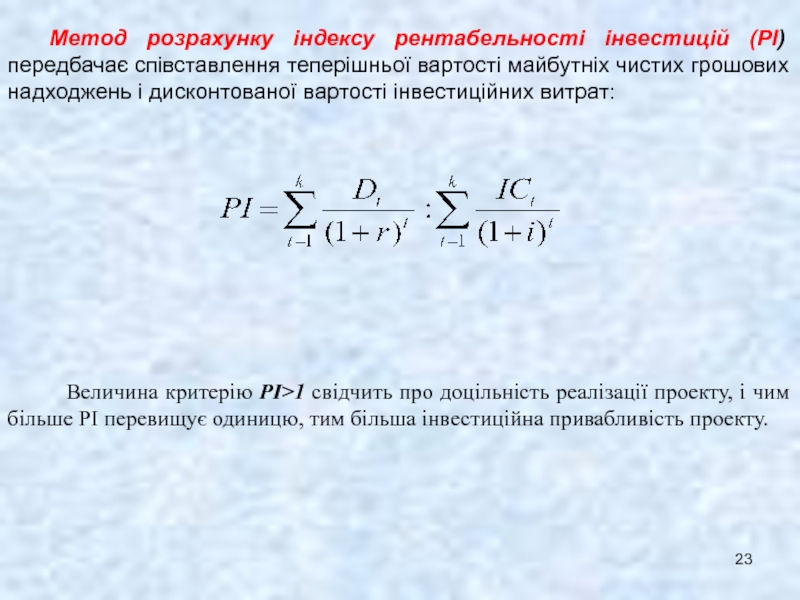 Слайд 23Метод розрахунку індексу рентабельності інвестицій (РІ) передбачає співставлення теперішньої вартості