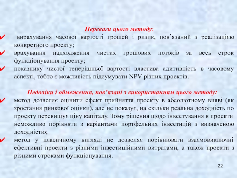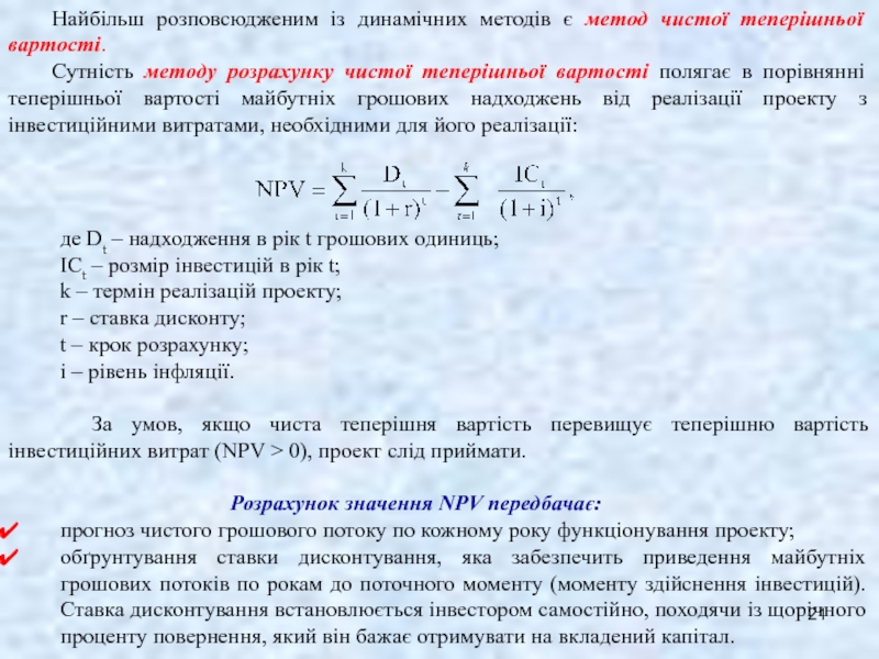 Слайд 21Найбільш розповсюдженим із динамічних методів є метод чистої теперішньої вартості.