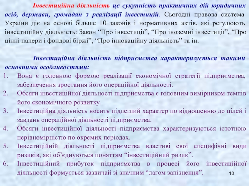 Слайд 10 Інвестиційна діяльність це сукупність практичних дій юридичних