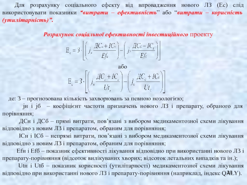 Для розрахунку соціального ефекту від впровадження нового ЛЗ (Ес) слід використовувати показники “витрати – ефективність” або “витрати – корисність (утилітарність)”.