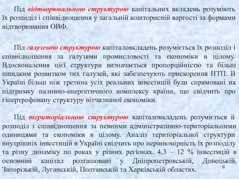 Слайд 9Під відтворювальною структурою капітальних вкладень розуміють їх розподіл і співвідношення