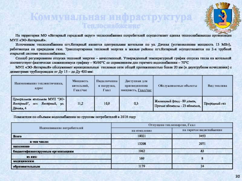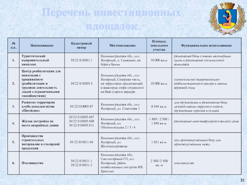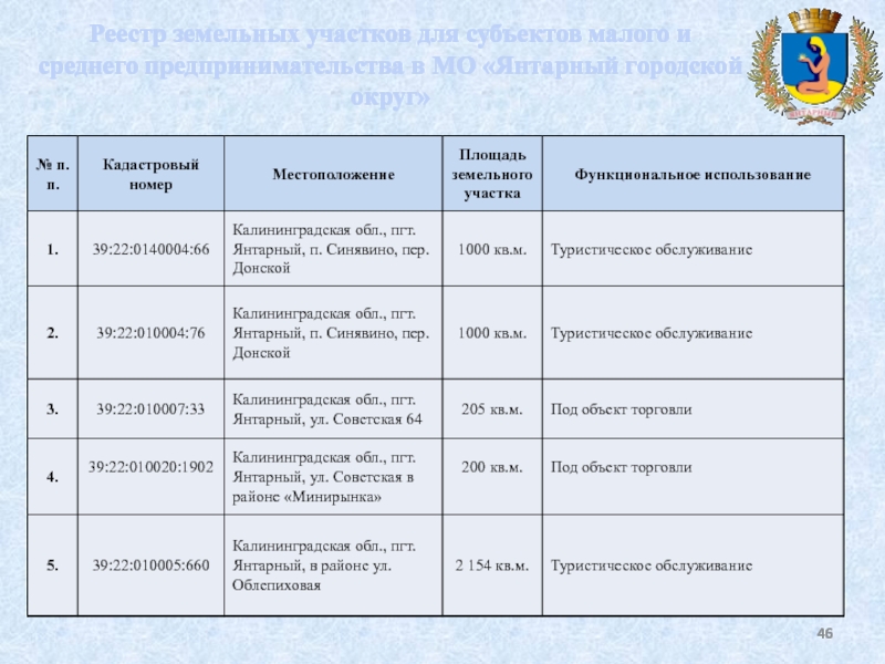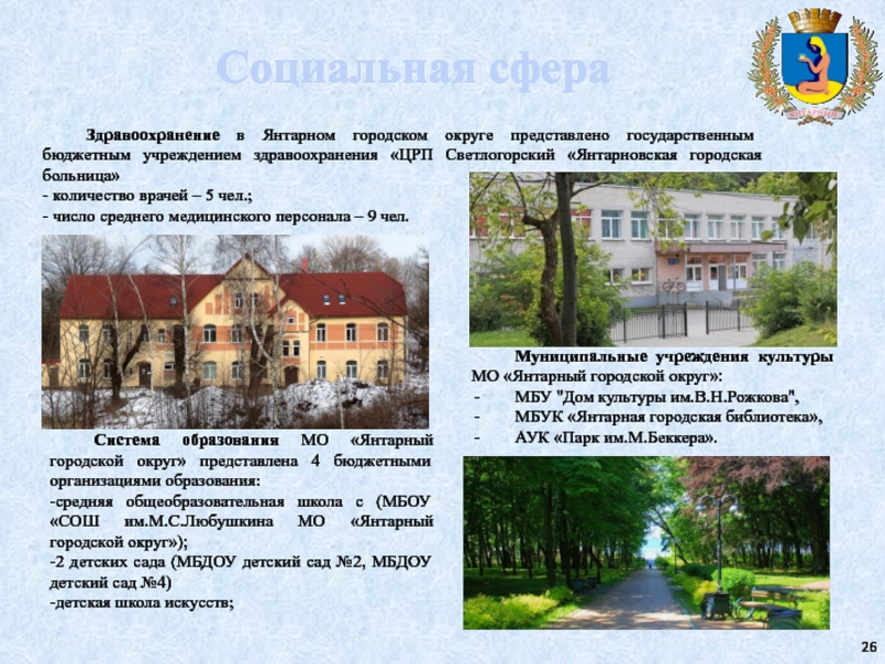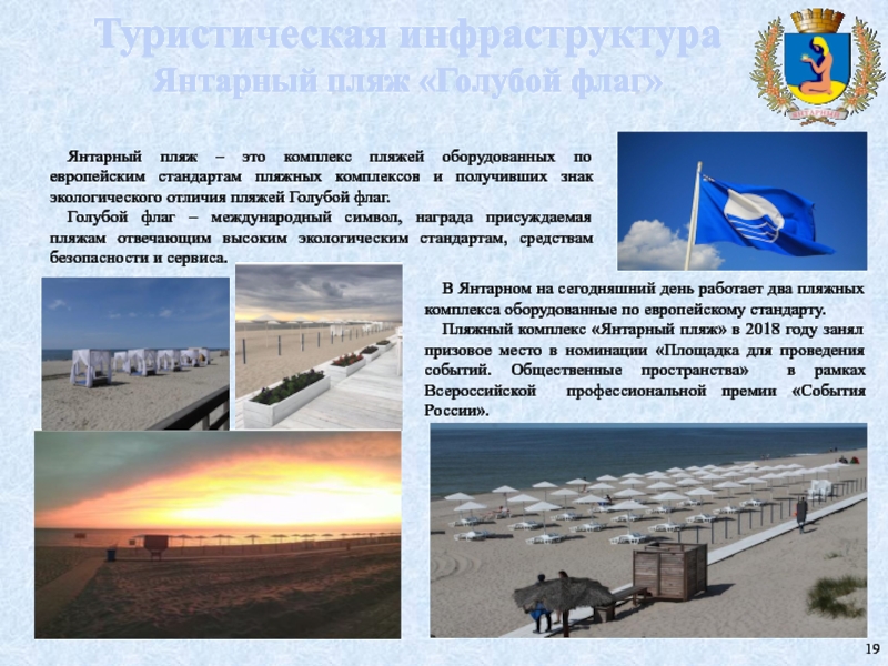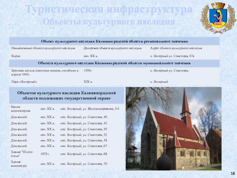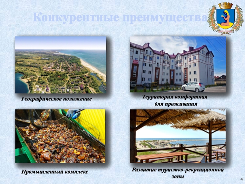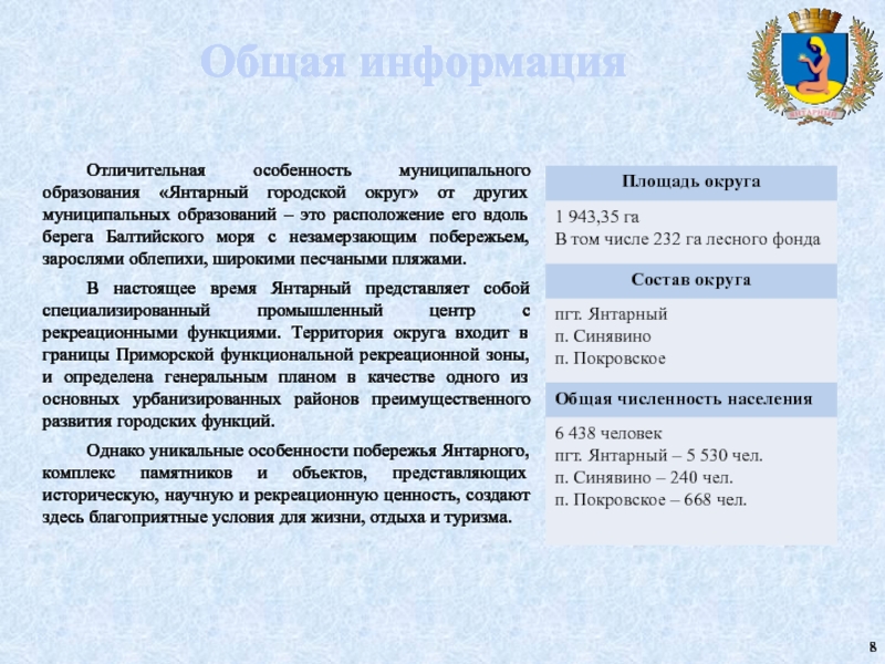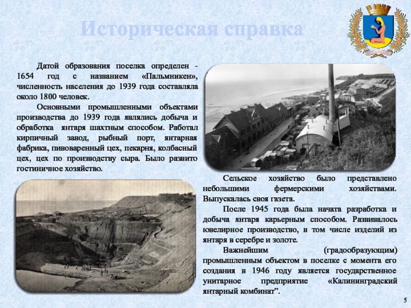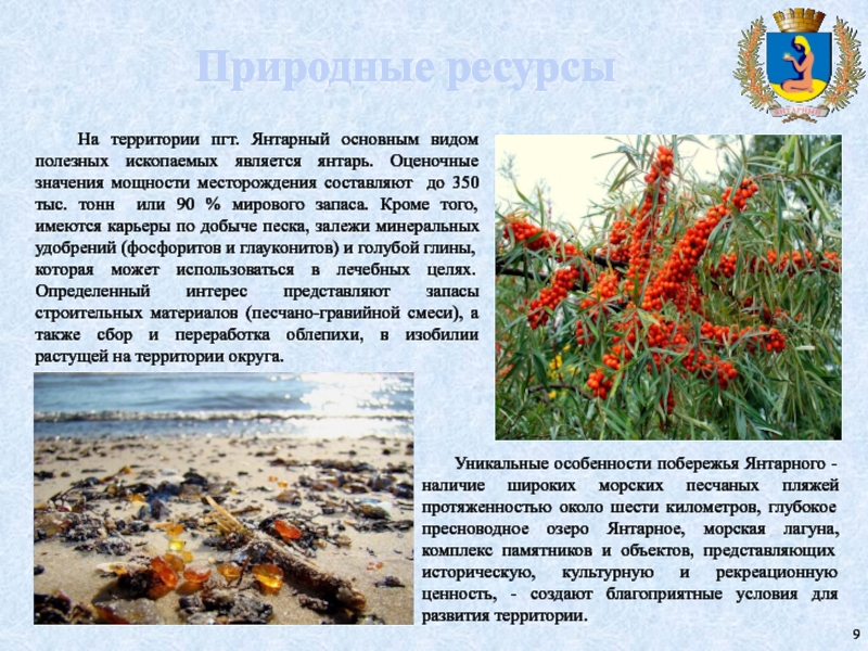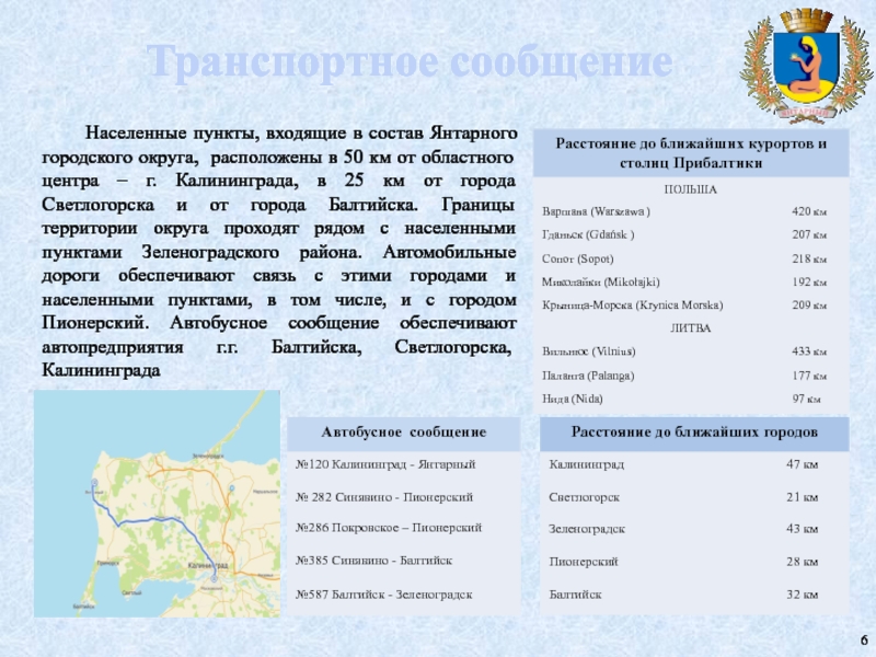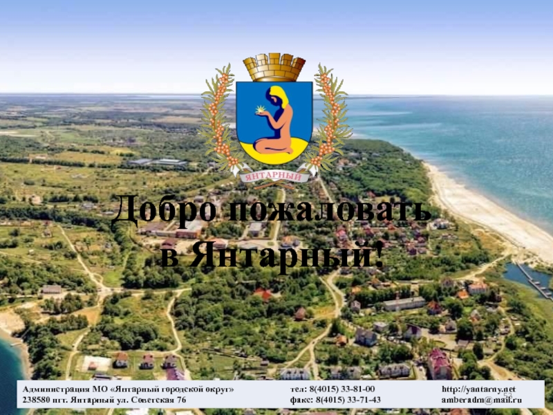 расположен на северо-западе Калининградской области, в 46 км. от областного центра – г. Калининграда.Янтарный – это край, где старая часть города: мост, кирха XIX века, парк, фахверковые дома – мирно соседствуют с новыми проектами: площадью Мастеров, променадом, гостиничными и пляжными комплексами. Сегодня активно развивается сфера туризма, янтарное производство и торговля. Формирование благоприятного инвестиционного климата является одним из основных условий динамичного развития Янтарного.