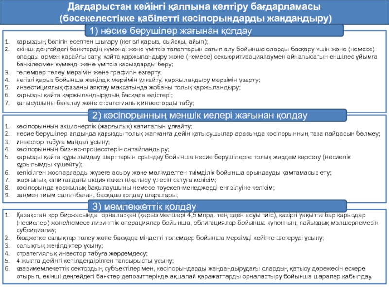 қарызды қайта құрылымдау шарттарын орындау бойынша несие берушілерге толық жәрдем көрсету (несиелік құрылымды күшейту);