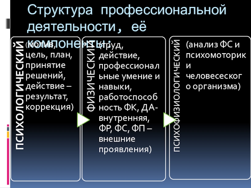 Слайд 5Структура профессиональной деятельности, её компоненты: