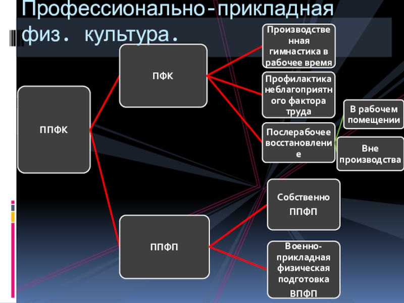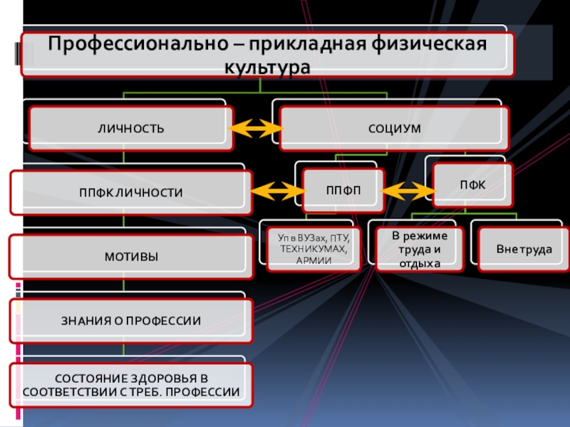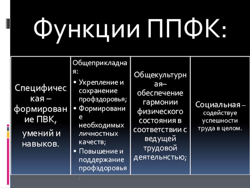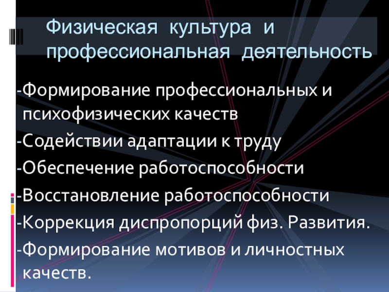 Физическая культура и профессиональная деятельностьФормирование профессиональных и психофизических качествСодействии адаптации к трудуОбеспечение работоспособностиВосстановление работоспособностиКоррекция диспропорций физ. Развития.Формирование