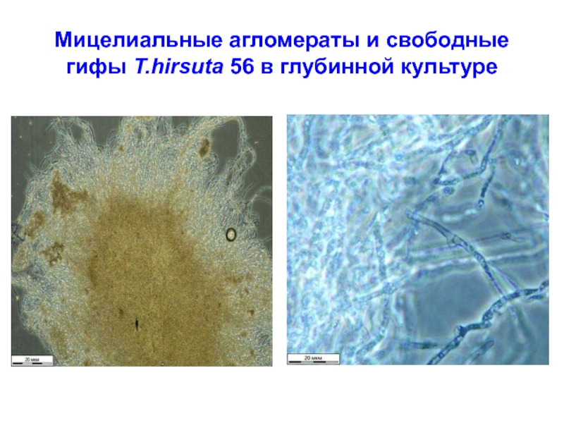 Слайд 41Мицелиальные агломераты и свободные гифы T.hirsuta 56 в глубинной культуре