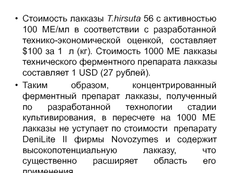 Слайд 61Стоимость лакказы T.hirsuta 56 с активностью 100 МЕ/мл в соответствии