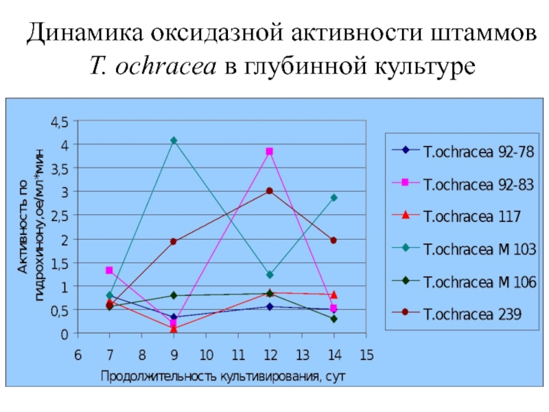 Слайд 24Динамика оксидазной активности штаммов T. ochracea в глубинной культуре