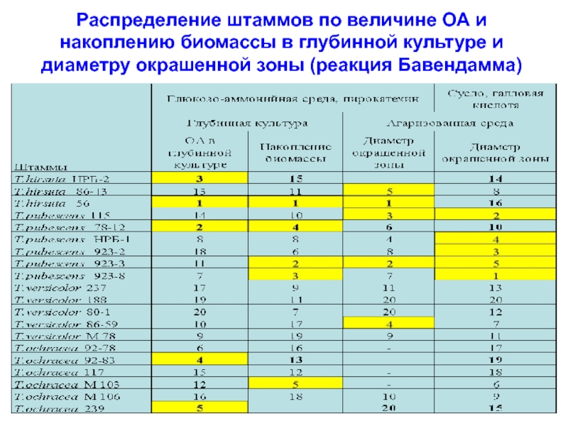 Слайд 21Распределение штаммов по величине ОА и накоплению биомассы в глубинной