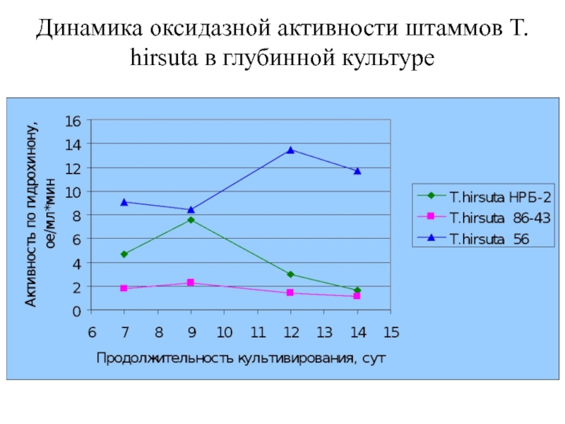 Слайд 23Динамика оксидазной активности штаммов T. hirsuta в глубинной культуре