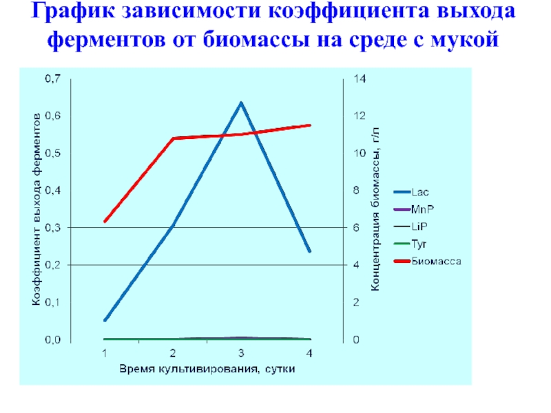 Слайд 57График зависимости коэффициента выхода ферментов от биомассы на среде с