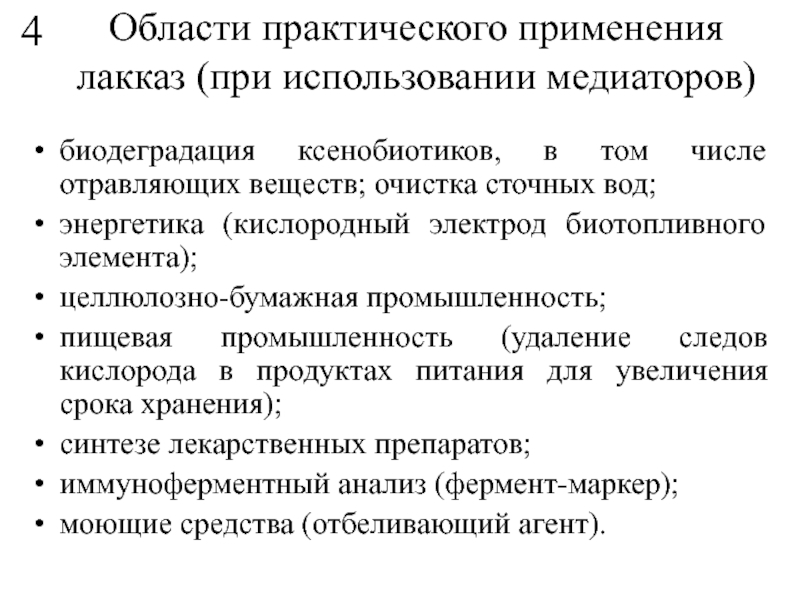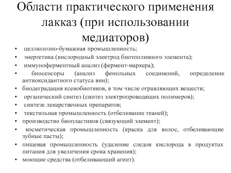 Слайд 13Области практического применения лакказ (при использовании медиаторов)