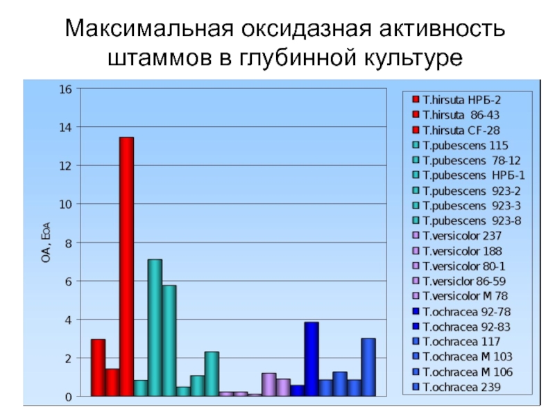 Слайд 20Максимальная оксидазная активность штаммов в глубинной культуре