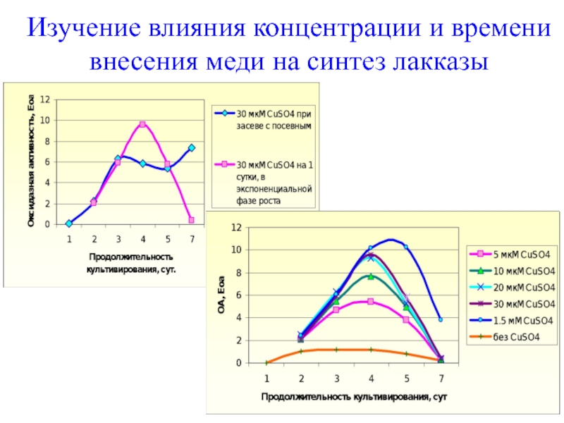 Слайд 35Изучение влияния концентрации и времени внесения меди на синтез лакказы