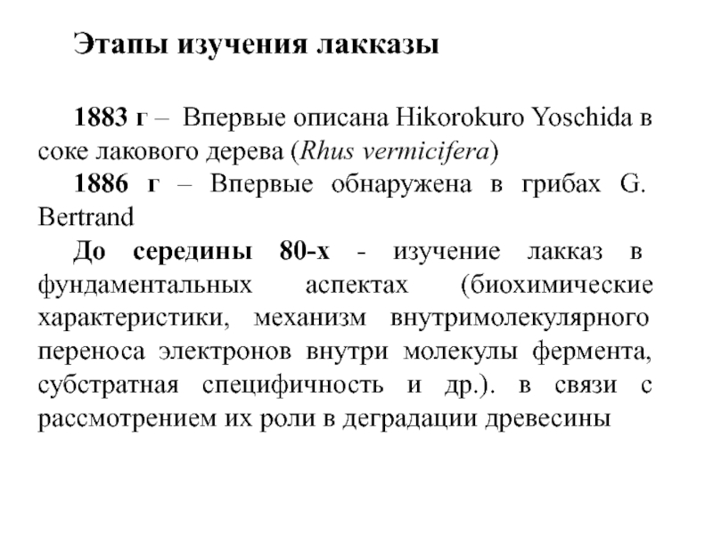 До середины 80-х - изучение лакказ в фундаментальных аспектах (биохимические характеристики, механизм внутримолекулярного переноса электронов внутри молекулы фермента, субстратная специфичность и др.). в связи с рассмотрением их роли в деградации древесины