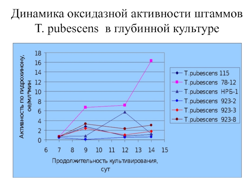 Слайд 22Динамика оксидазной активности штаммов T. pubescens в глубинной культуре