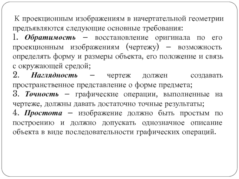 Слайд 12 К проекционным изображениям в начертательной геометрии предъявляются следующие основные