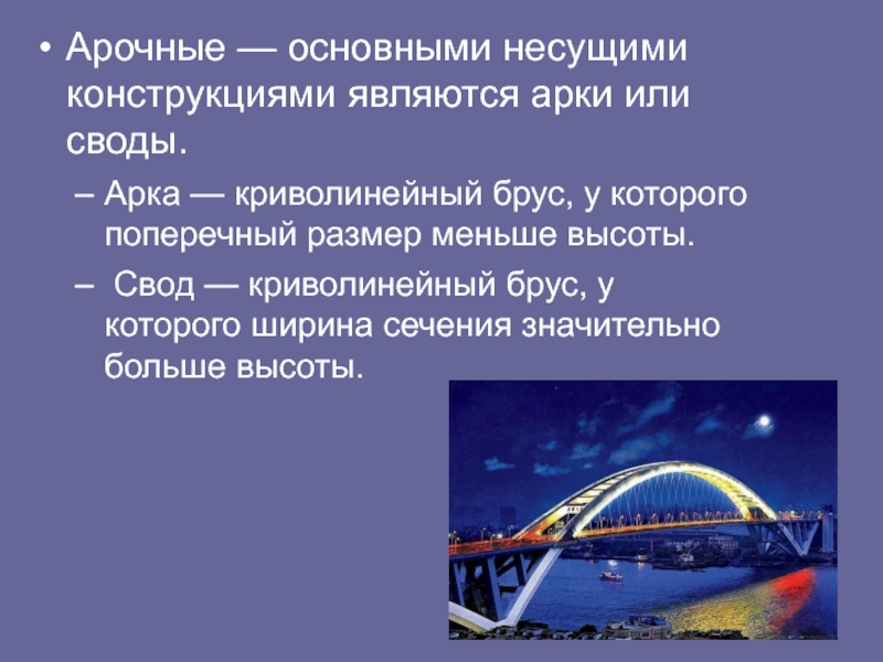 Слайд 39Арочные — основными несущими конструкциями являются арки или своды.