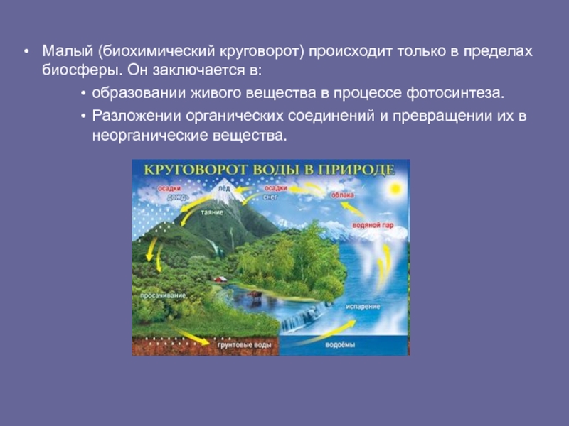 Слайд 5Малый (биохимический круговорот) происходит только в пределах биосферы. Он заключается