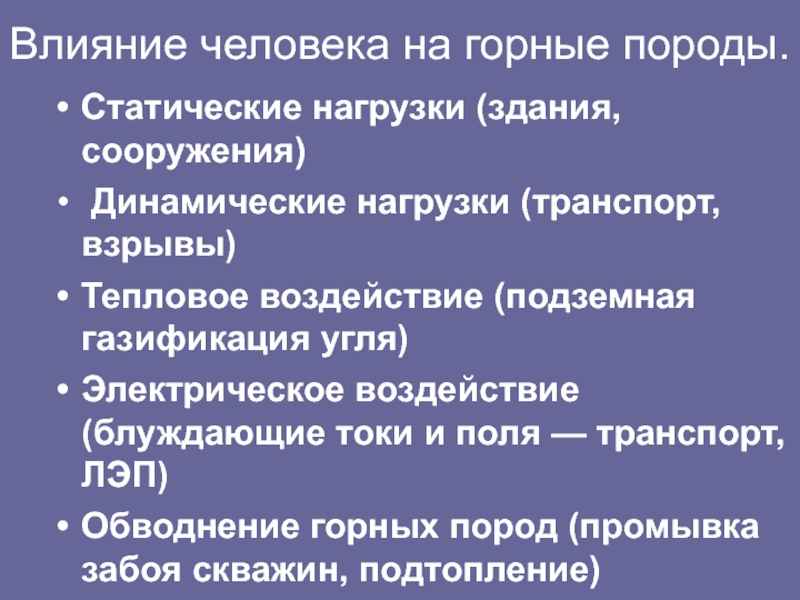 Механические нарушения почвенного покрова- при отводе земель под строительство промышленных объектов, отторжение земель для прокладки линейно-протяжных сооружений, возведении гидротехнических и гидромелиоративных систем, при открытой разработке месторождений полезных ископаемый итп.