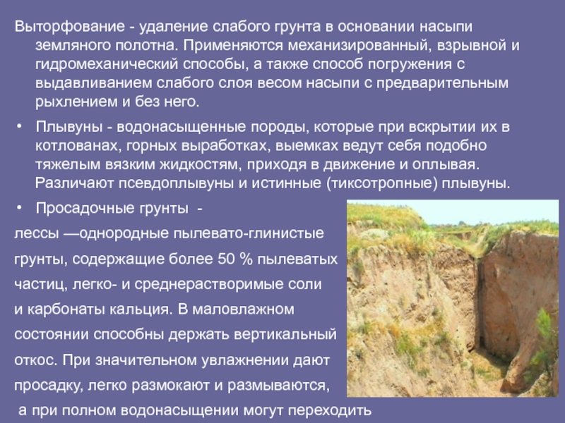 Слайд 30Выторфование - удаление слабого грунта в основании насыпи земляного полотна.