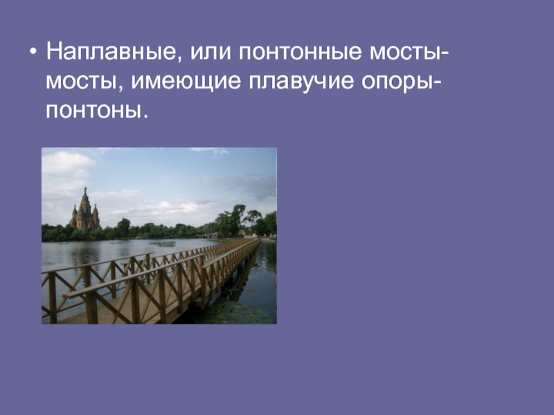 Слайд 41Наплавные, или понтонные мосты-мосты, имеющие плавучие опоры-понтоны.