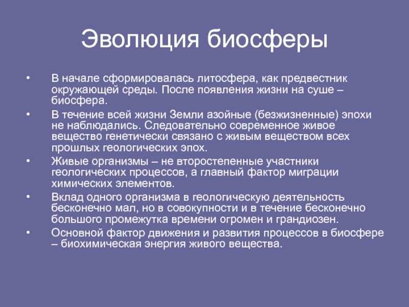 Основной фактор движения и развития процессов в биосфере – биохимическая энергия живого вещества.