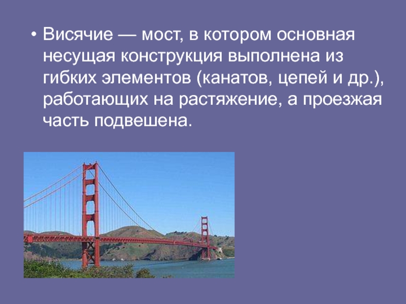 Слайд 37Висячие — мост, в котором основная несущая конструкция выполнена из гибких