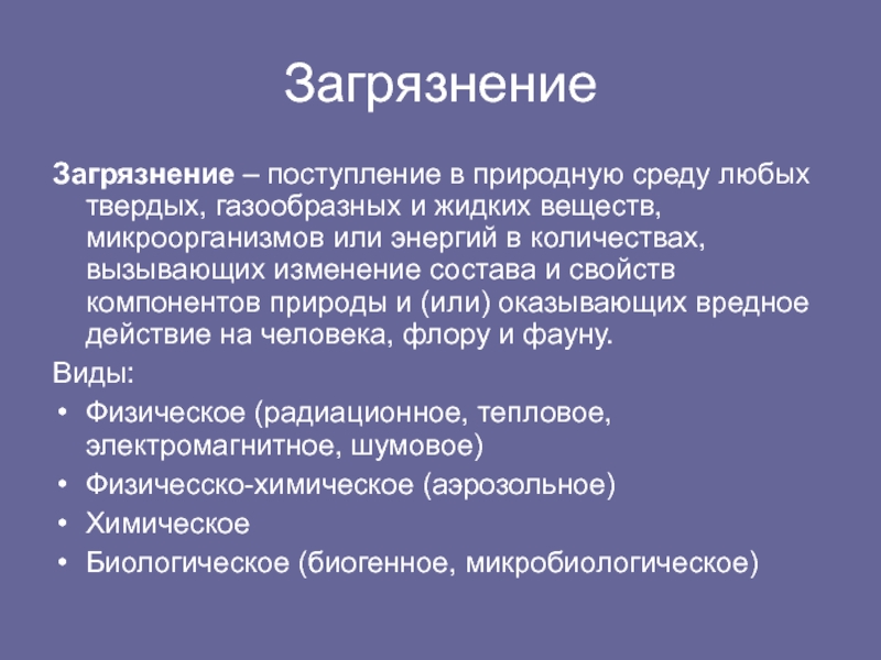 Загрязнение – поступление в природную среду любых твердых, газообразных и