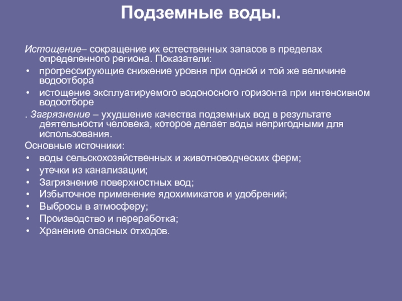 из водопроводной и канализационной сетей и пр. Или – повышение уровня грунтовых вод до критических величин, при которых отсутствуют необходимые условия строительства и эксплуатации как отдельных зданий так и территории в целом.