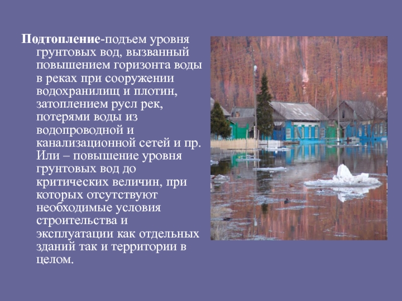 Слайд 15Подтопление-подъем уровня грунтовых вод, вызванный повышением горизонта воды в реках