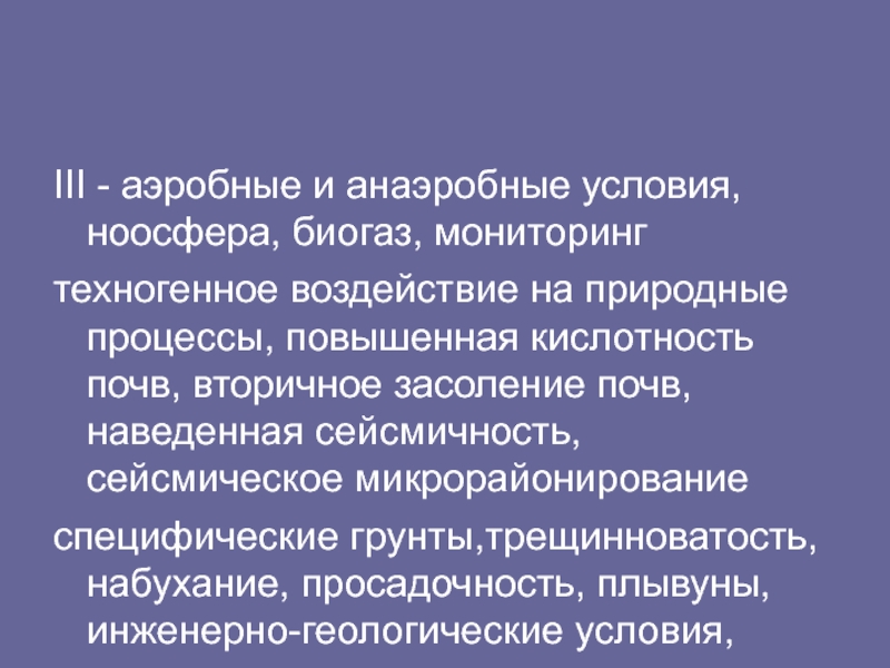 Слайд 42III - аэробные и анаэробные условия, ноосфера, биогаз, мониторинг