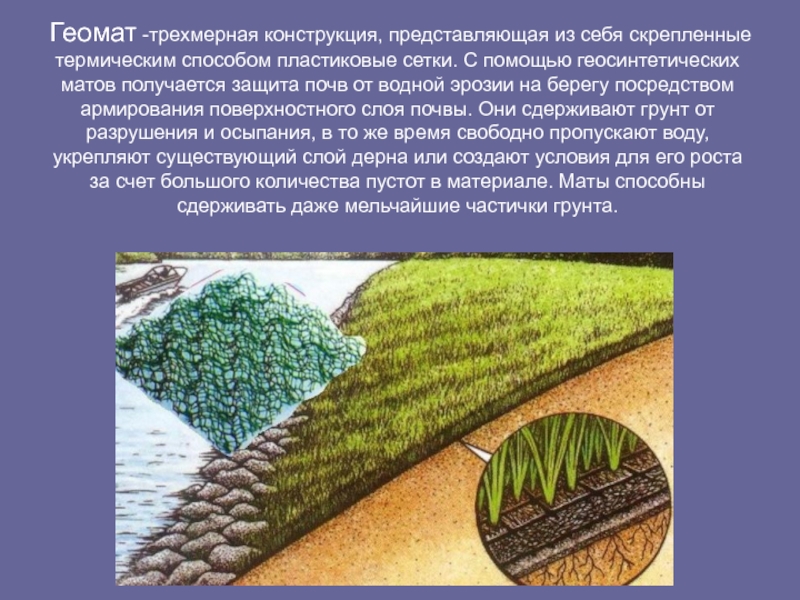 эрозии на берегу посредством армирования поверхностного слоя почвы. Они сдерживают грунт от разрушения и осыпания, в то же время свободно пропускают воду, укрепляют существующий слой дерна или создают условия для его роста за счет большого количества пустот в материале. Маты способны сдерживать даже мельчайшие частички грунта.