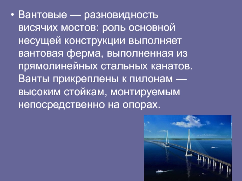 Слайд 38Вантовые — разновидность висячих мостов: роль основной несущей конструкции выполняет вантовая