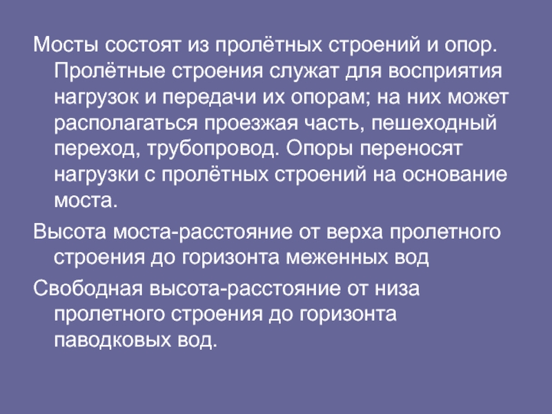 Слайд 33Мосты состоят из пролётных строений и опор. Пролётные строения служат