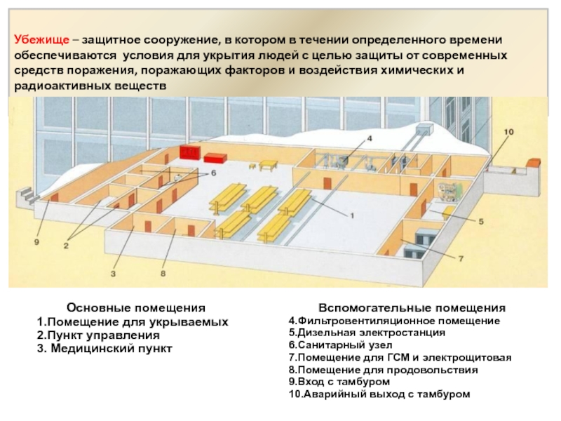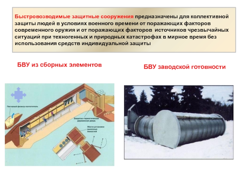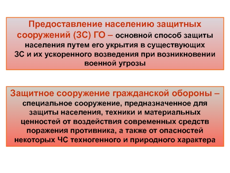 при возникновении военной угрозыЗащитное сооружение гражданской обороны – специальное сооружение, предназначенное для защиты населения, техники и материальных ценностей от воздействия современных средств поражения противника, а также от опасностей некоторых ЧС техногенного и природного характера