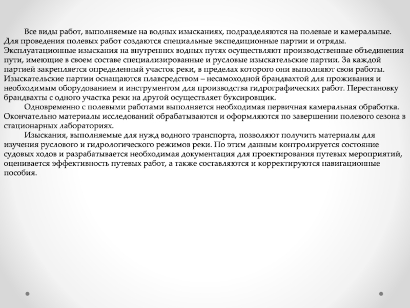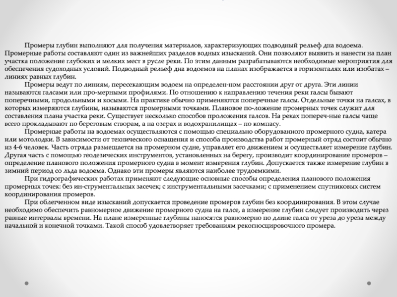 После обработки журнала промера глубин на план участка нано-сятся закоординированные промерные точки с соответствующими значе-ниями приведенных глубин. Плановое положение промежуточных про-мерных точек, глубины в которых измерялись без координирования, определяется интерполяцией между закоординированными точками с учетом направления движения промерного судна. Глубины в этих точках выписываются также с учетом срезки, путем приведения их к проектному уровню путевых работ. В прибрежной области в целом ряде точек рабочие глубины могут оказаться меньше величины срезки. Приведенные глубины в этих точках показывают со знаком плюс (+).