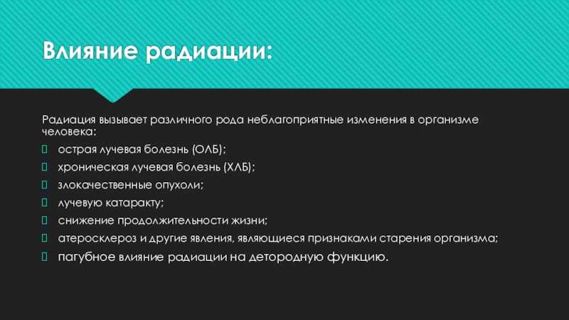 Влияние радиации:Радиация вызывает различного рода неблагоприятные изменения в организме человека:острая лучевая болезнь (ОЛБ);хроническая лучевая болезнь (ХЛБ);злокачественные опухоли;лучевую