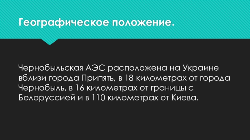 Географическое положение.Чернобыльская АЭС расположена на Украине вблизи города Припять, в 18 километрах от города Чернобыль, в 16