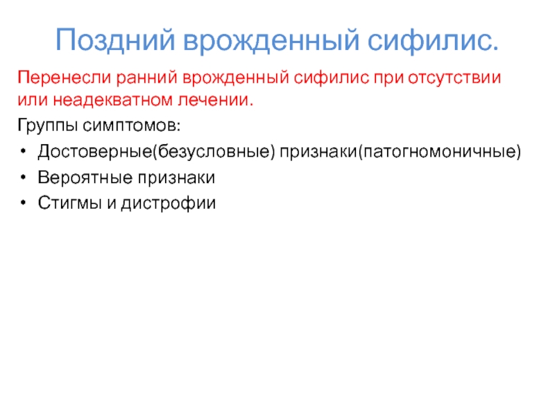 Классификация врожденного сифилиса в зависимости от сроков обнаружения и особенностей проявлений: