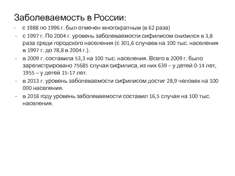 г. уровень заболеваемости сифилисом снизился в 3,8 раза среди городского населения (с 301,6 случаев на 100 тыс. населения в 1997 г. до 78,8 в 2004 г.).