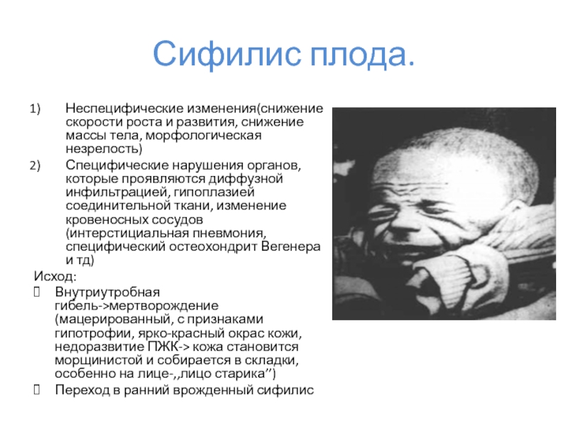 Внутриутробная гибель->мертворождение(мацерированный, с признаками гипотрофии, ярко-красный окрас кожи, недоразвитие ПЖК-> кожа становится морщинистой и собирается в складки, особенно на лице-,,лицо старика’’)