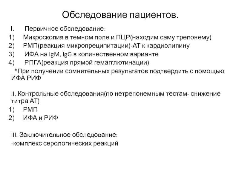 II. Контрольные обследования(по нетрепонемным тестам- снижение титра АТ)