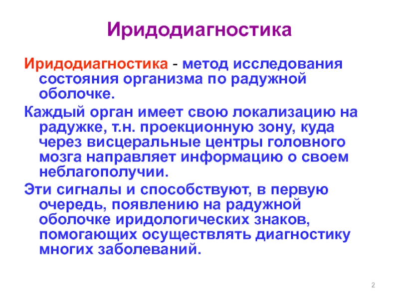 куда через висцеральные центры головного мозга направляет информацию о своем неблагополучии. Эти сигналы и способствуют, в первую очередь, появлению на радужной оболочке иридологических знаков, помогающих осуществлять диагностику многих заболеваний.