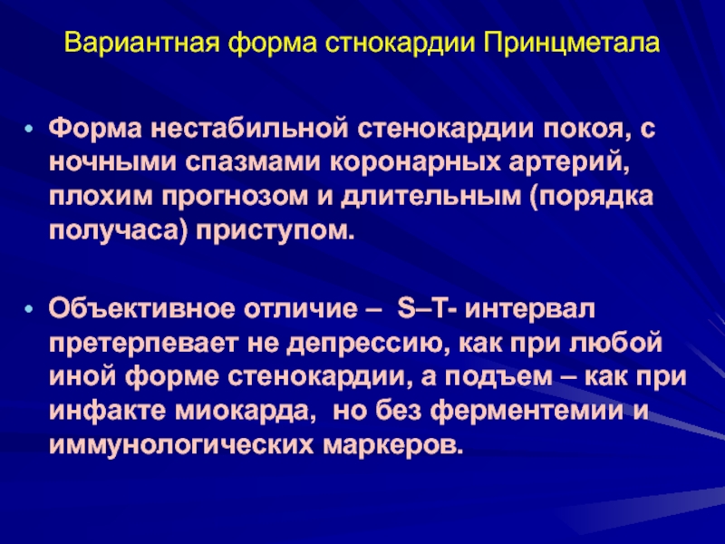 отличие – S–T- интервал претерпевает не депрессию, как при любой иной форме стенокардии, а подъем – как при инфакте миокарда, но без ферментемии и иммунологических маркеров.