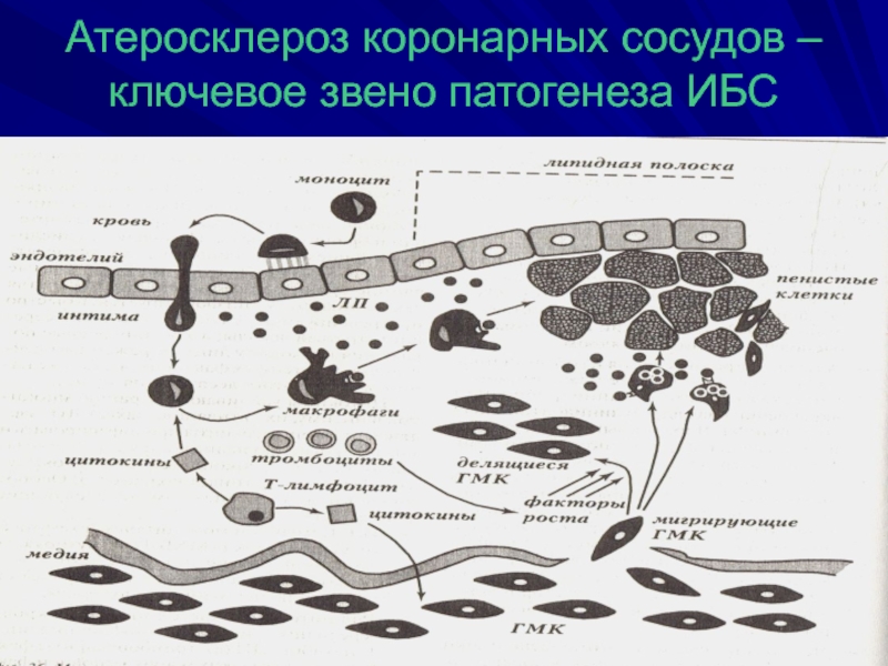 Слайд 7Атеросклероз коронарных сосудов – ключевое звено патогенеза ИБС