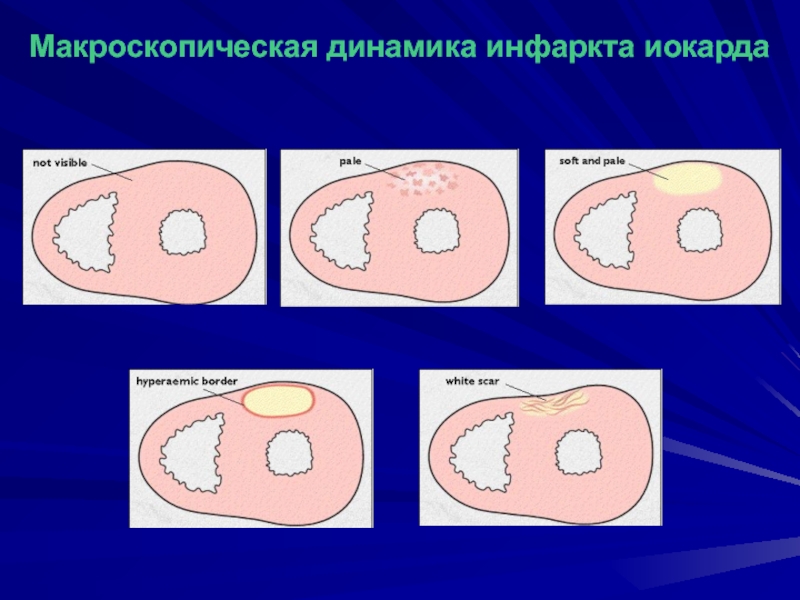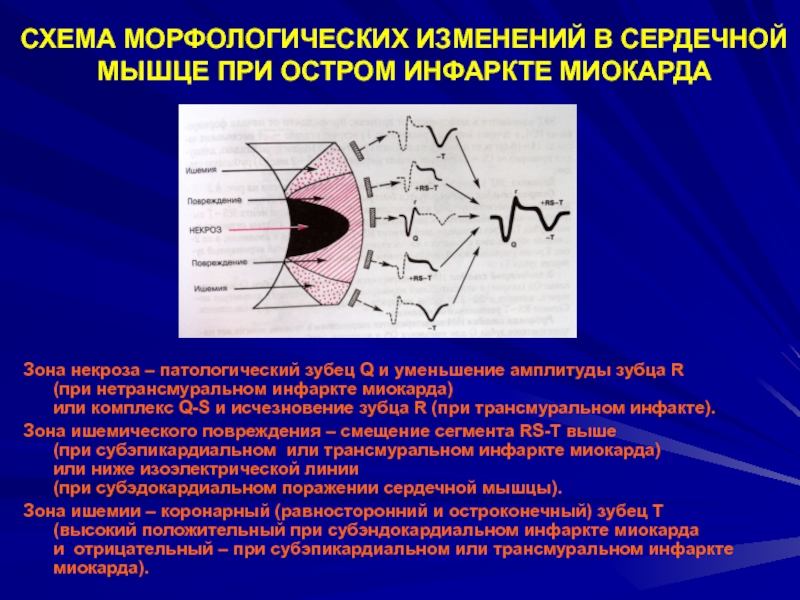 Слайд 30СХЕМА МОРФОЛОГИЧЕСКИХ ИЗМЕНЕНИЙ В СЕРДЕЧНОЙ МЫШЦЕ ПРИ ОСТРОМ ИНФАРКТЕ МИОКАРДА
